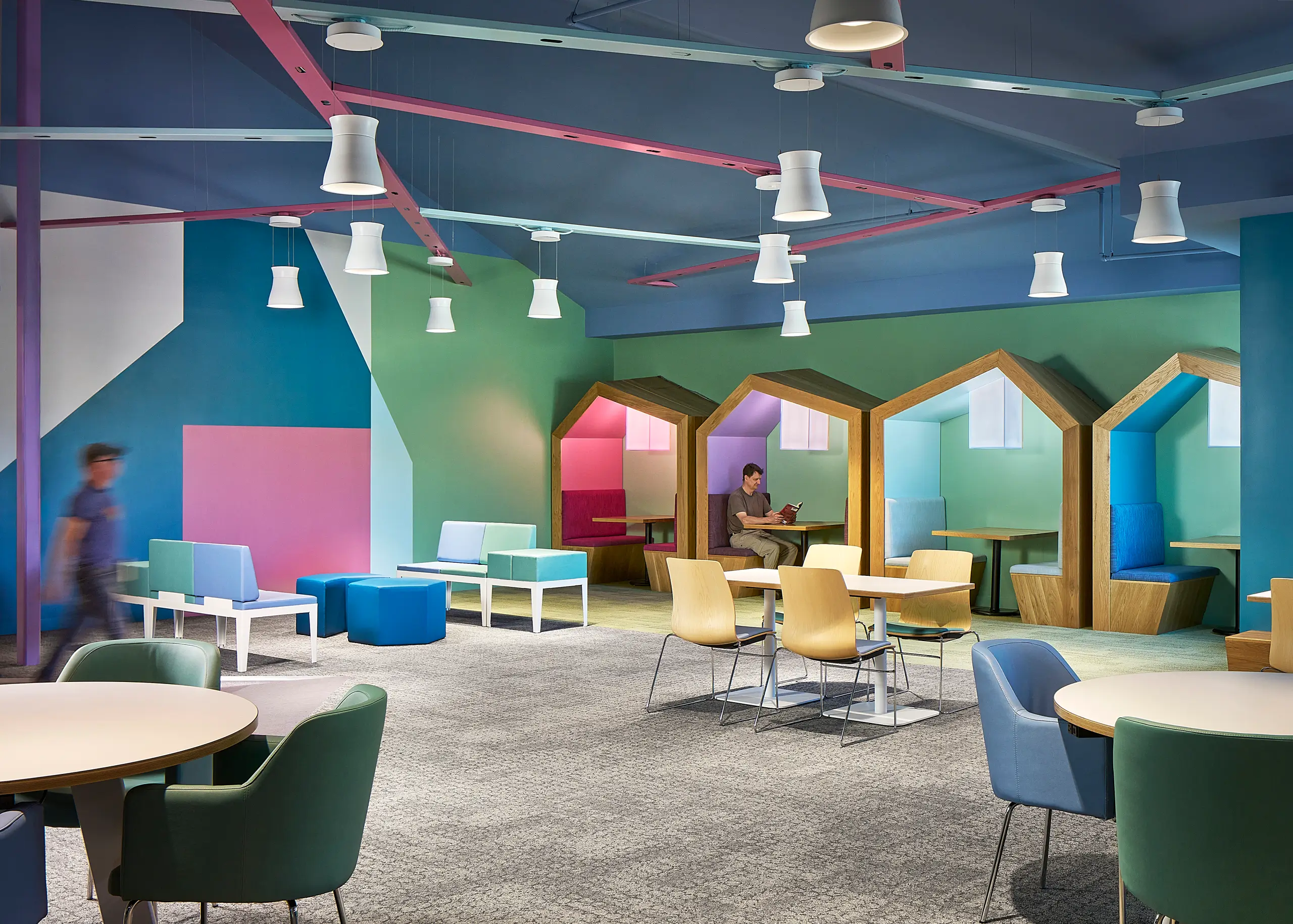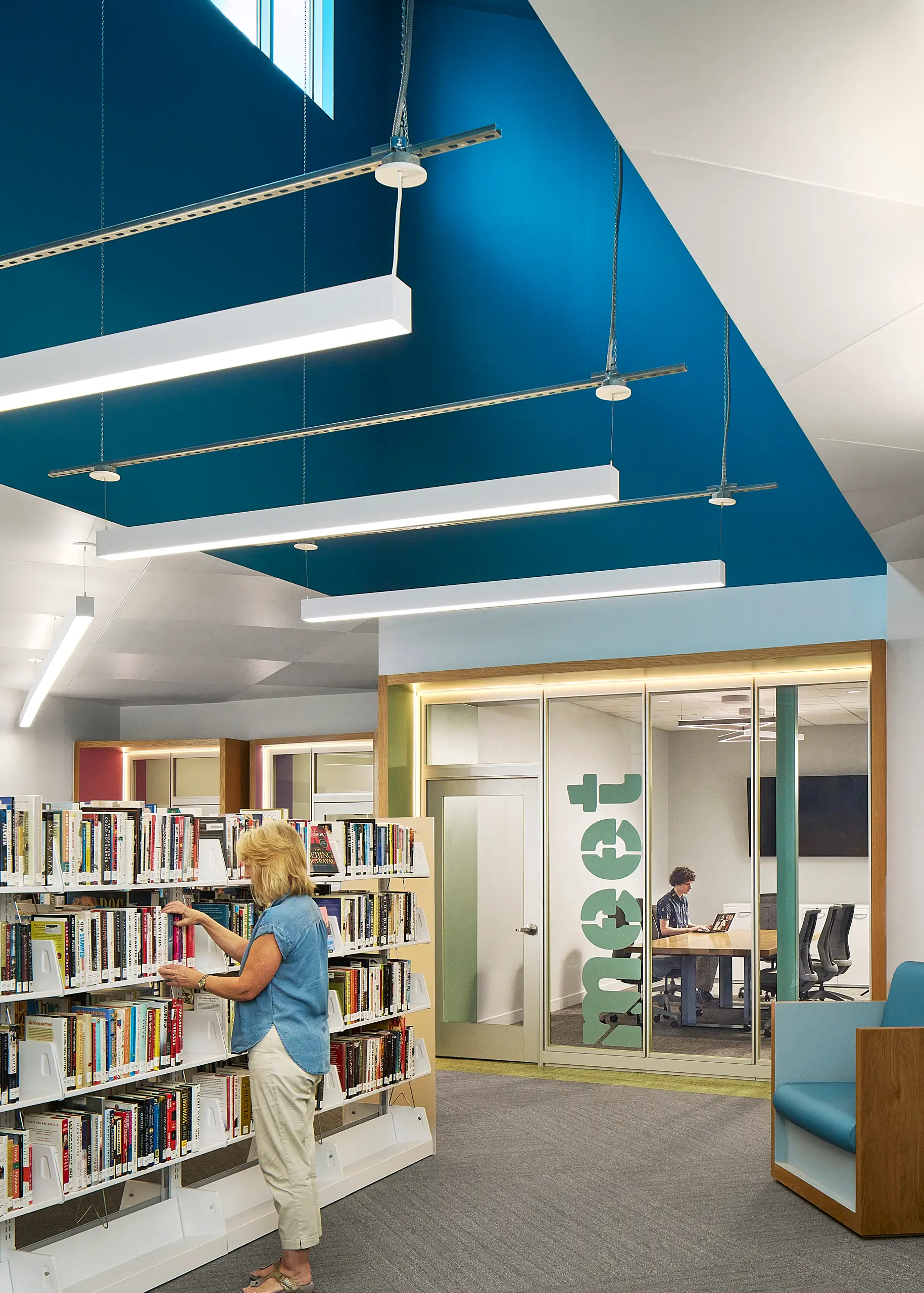 The pitched roofs of the study tables reflect the rooftops of the surrounding neighborhood. Designed as rooms within rooms, the booths create intimate places for study, social interaction, or quiet retreat, an approach supported by research showing that lower ceilings can encourage focus and concentration.