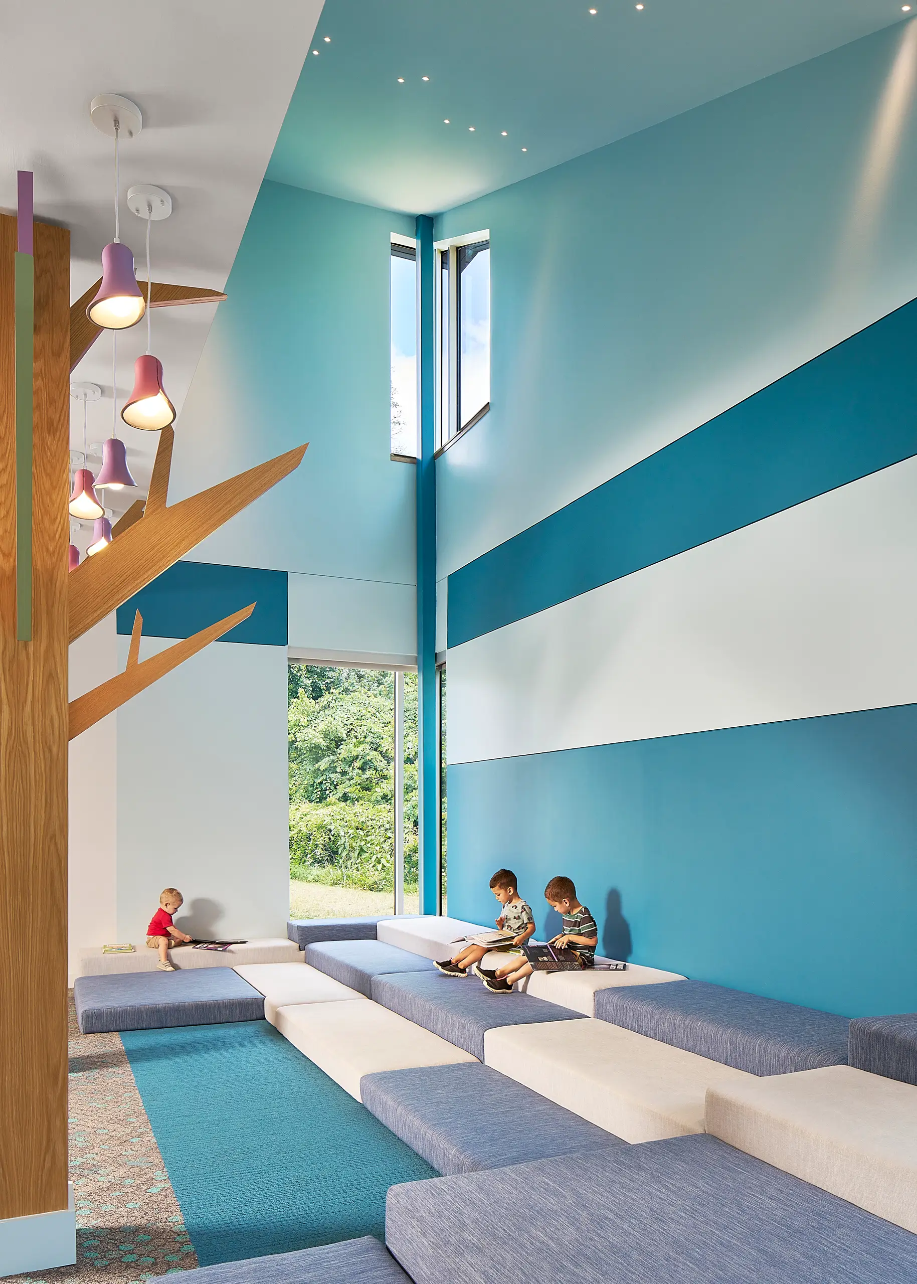 Custom wood reading trees create a playful and inviting environment that encourages exploration and imagination. Crafted from the same warm, natural wood, these sculptural elements provide places to read, gather, and discover while reinforcing the character of the space. More than furniture, the reading trees become landmarks that help define the children’s area as a place of learning, comfort, and delight.