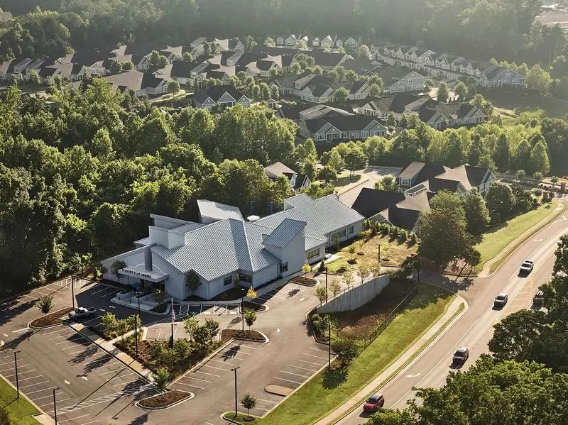 Aerial of library showing adjacent neighbor hood roof tops