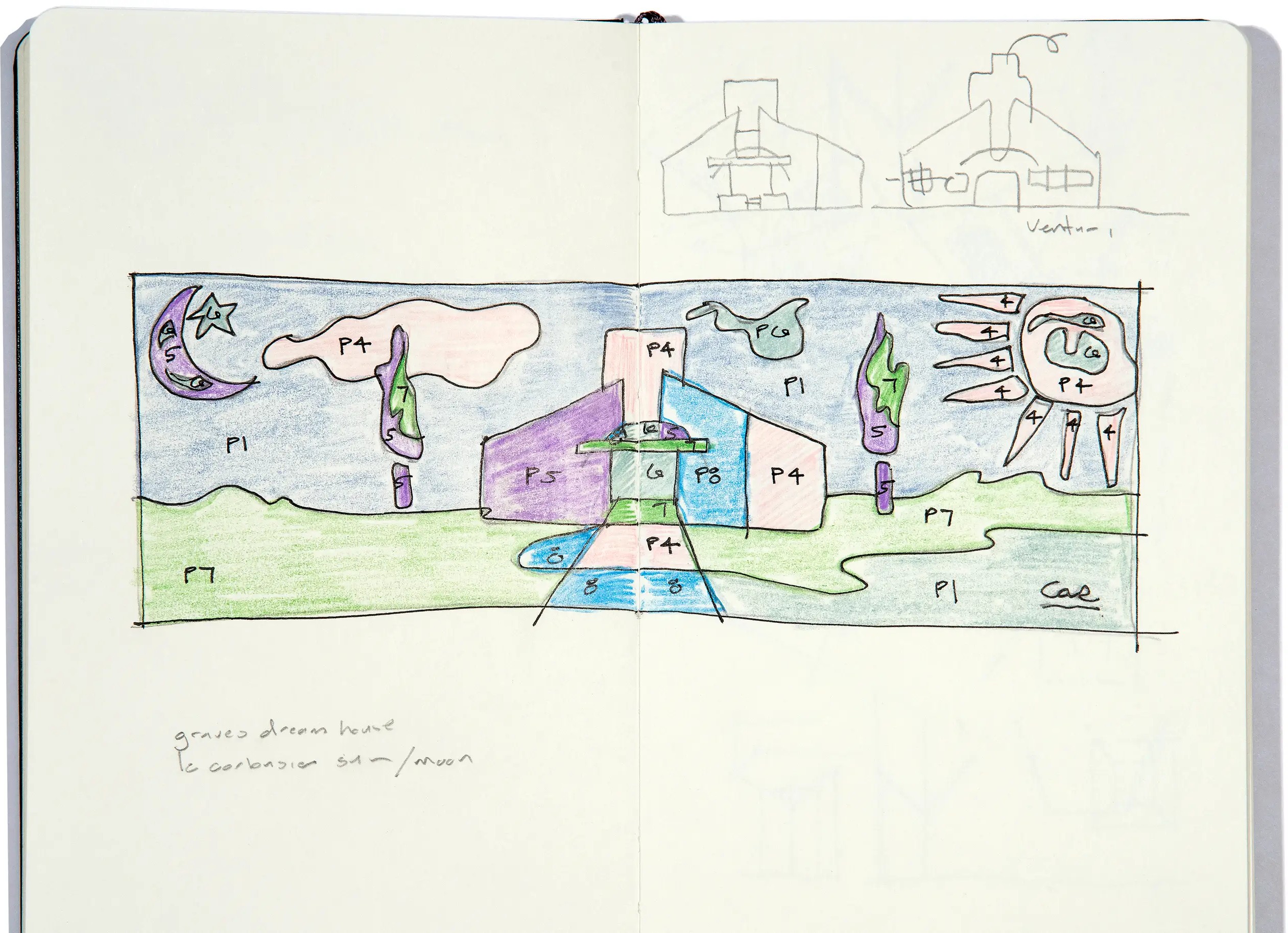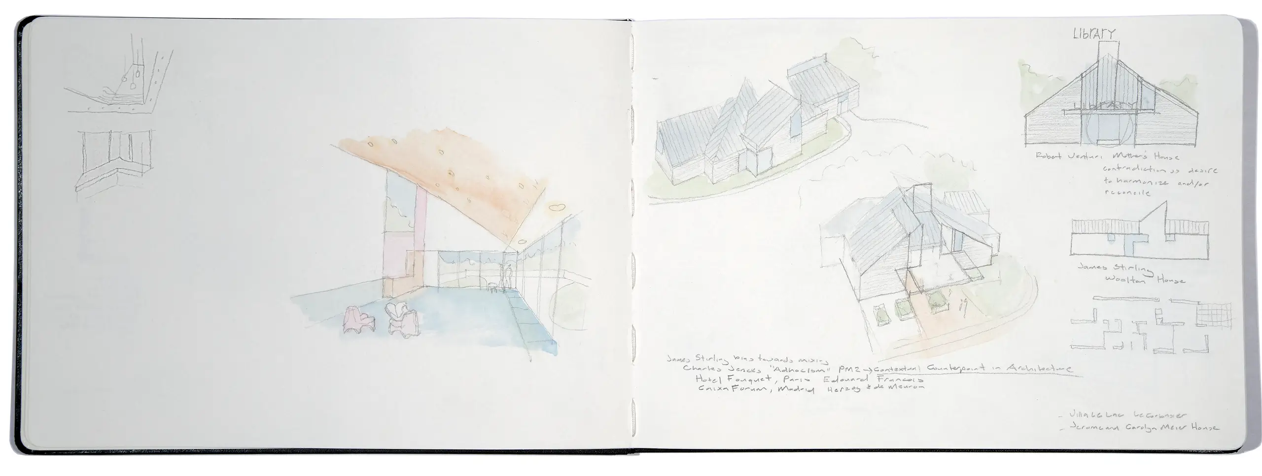 The side elevation draws inspiration from James Stirling’s early work, specifically his 1958 unbuilt House in North London, known for its distinctive massing and stark gabled forms. The library adopts a similar architectural language—more sculptural than symbolic—arranging its volumes to emphasize asymmetry, layering, and tension. Tilted and intersecting rooflines, along with deliberately misaligned forms, echo the collage-like qualities of Stirling’s experiments, celebrating his skill at blending functionality with expressive drama.