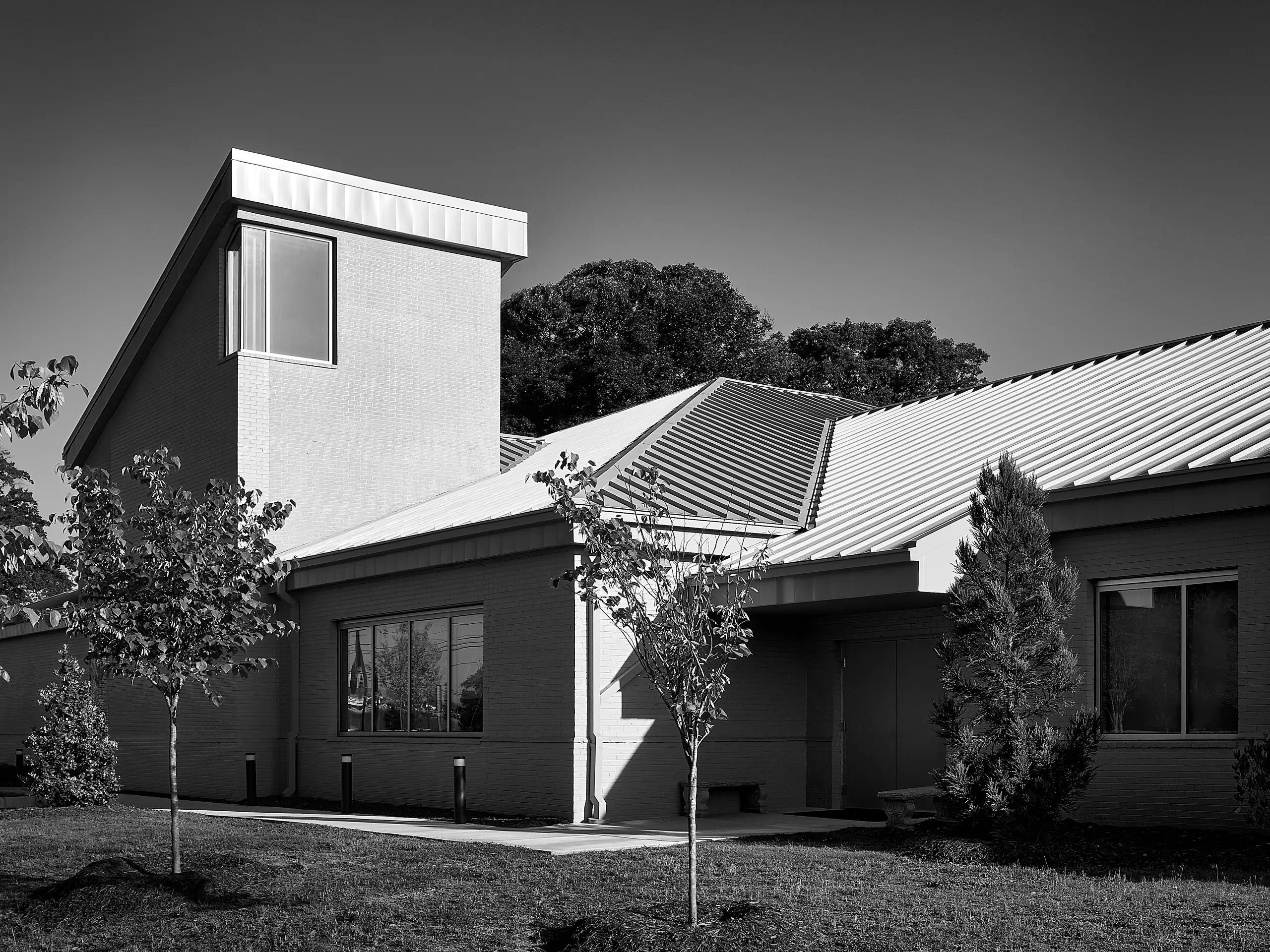 The Hickory Flat Library embodies New Postmodern (PM2) architecture. Its front façade playfully reimagines Robert Venturi’s house for his mother shifting planes, altering windows, and distorting form as if the original had been passed through a copy machine and misaligned, resulting in a witty and dynamic composition The gray exterior palette recalls the black-and-white tonesimagery of architectural history, offering atongue-in-cheekreflection on how buildingsare remembered.